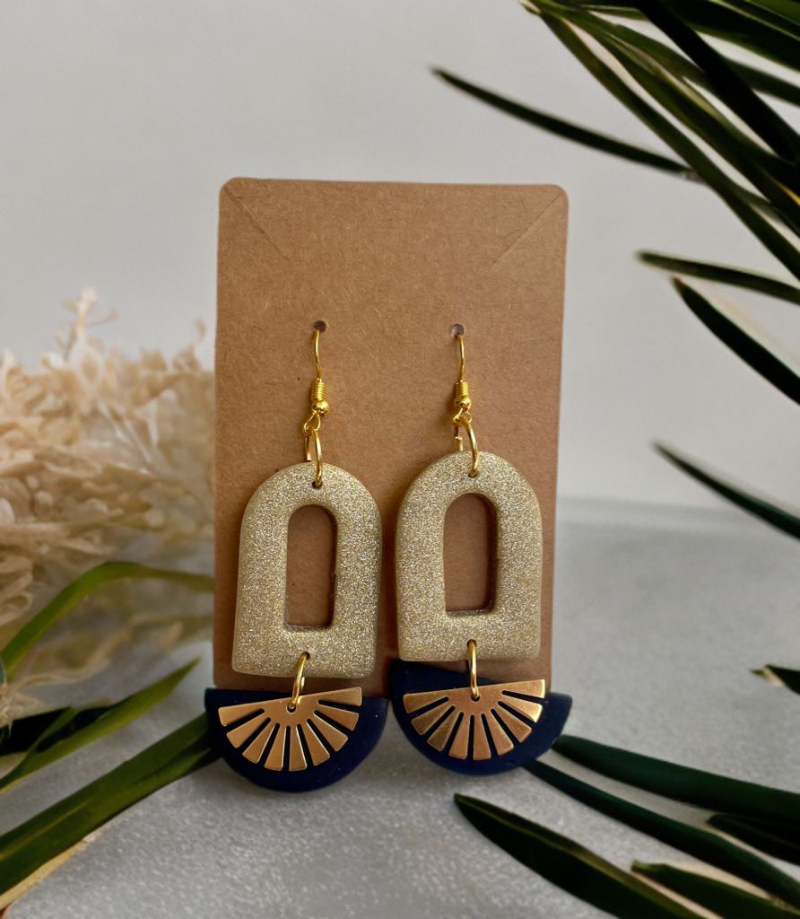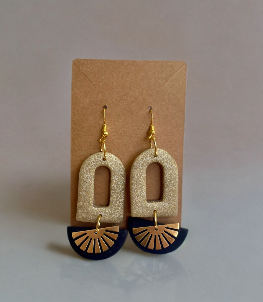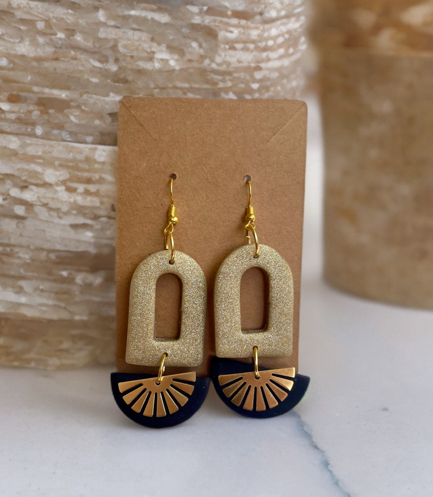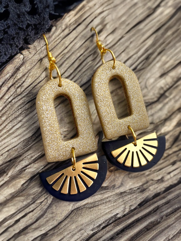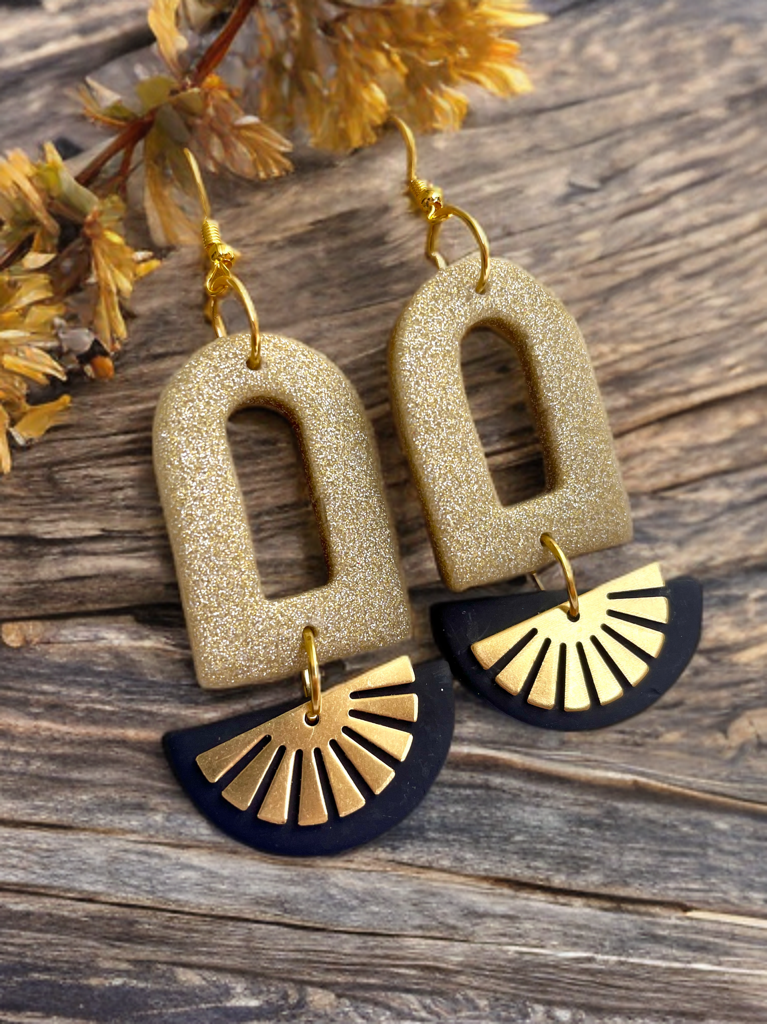 Modern handcrafted in glitter gold and black clay dangle earrings crafted with hypoallergenic metals for sensitive skin.