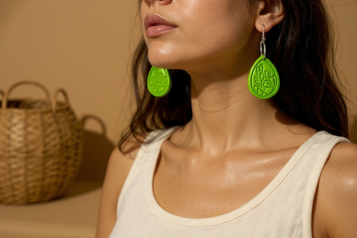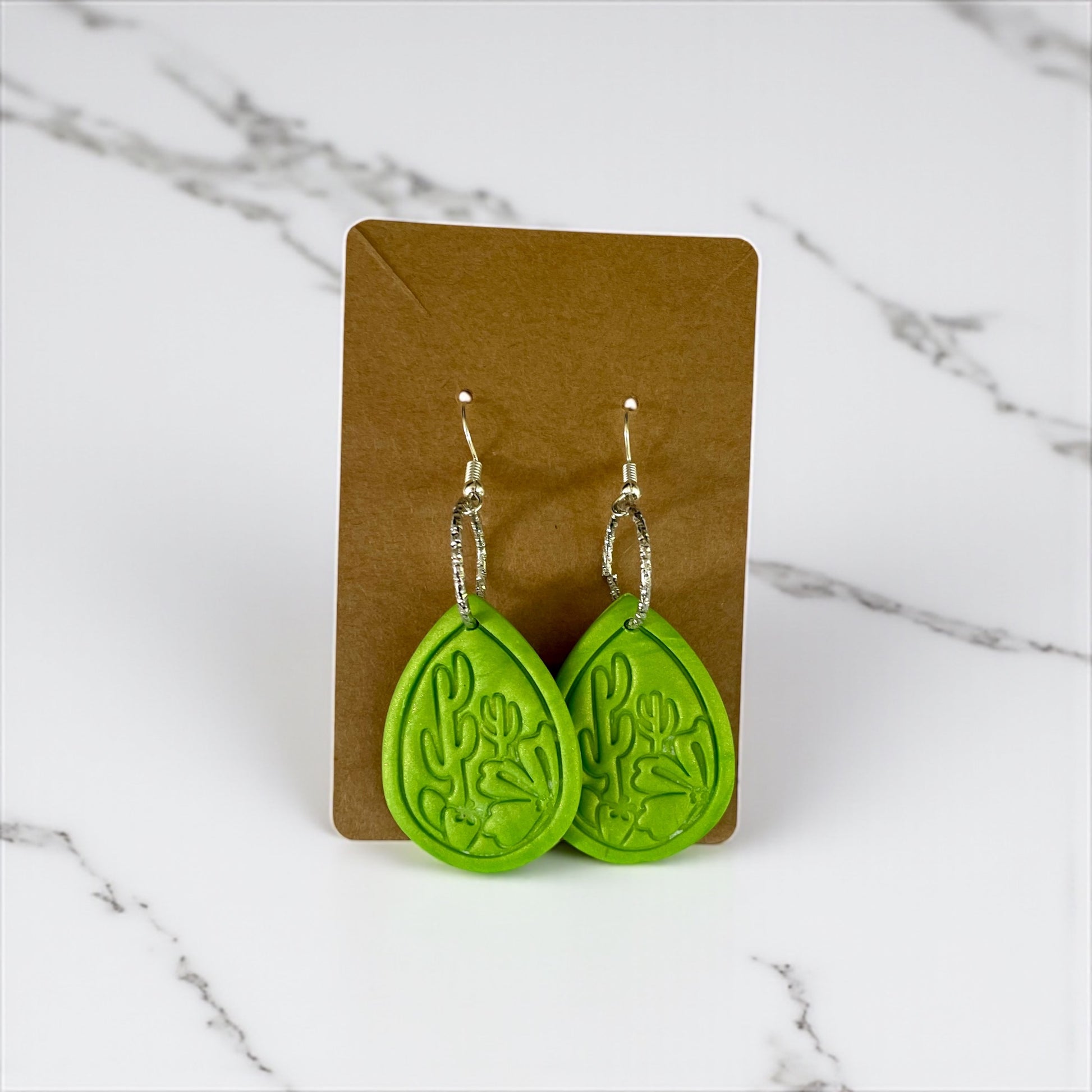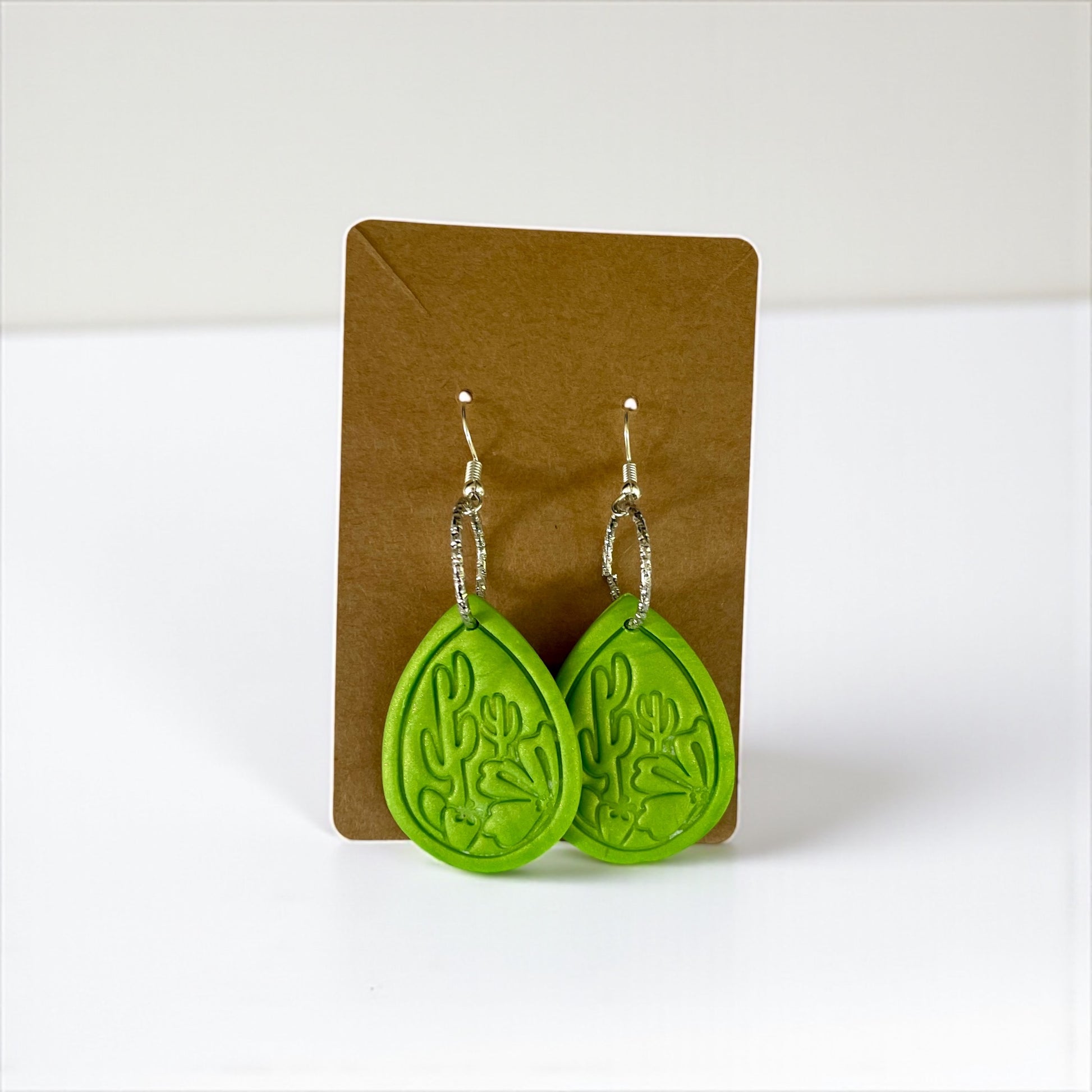 Handcrafted cactus shimmer clay earrings made with hypoallergenic metal for sensitive skin.