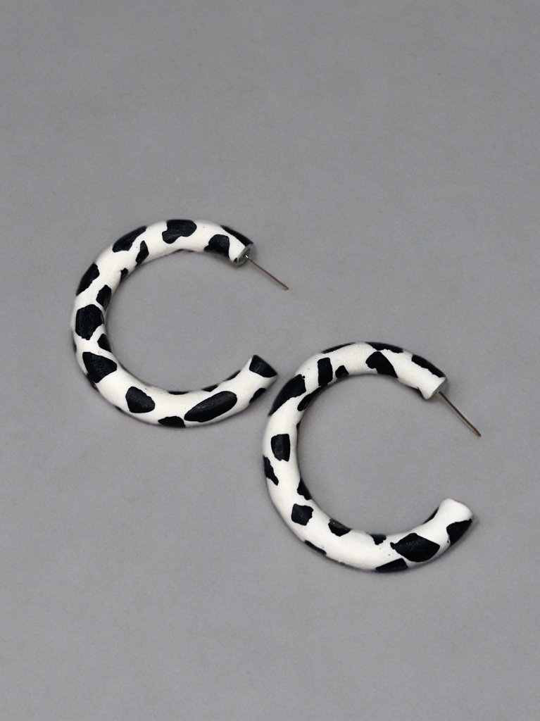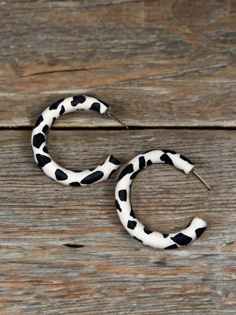 Handcrafted Cow Print Clay Hoop Earrings made with hypoallergenic metal perfect for sensitive skin.